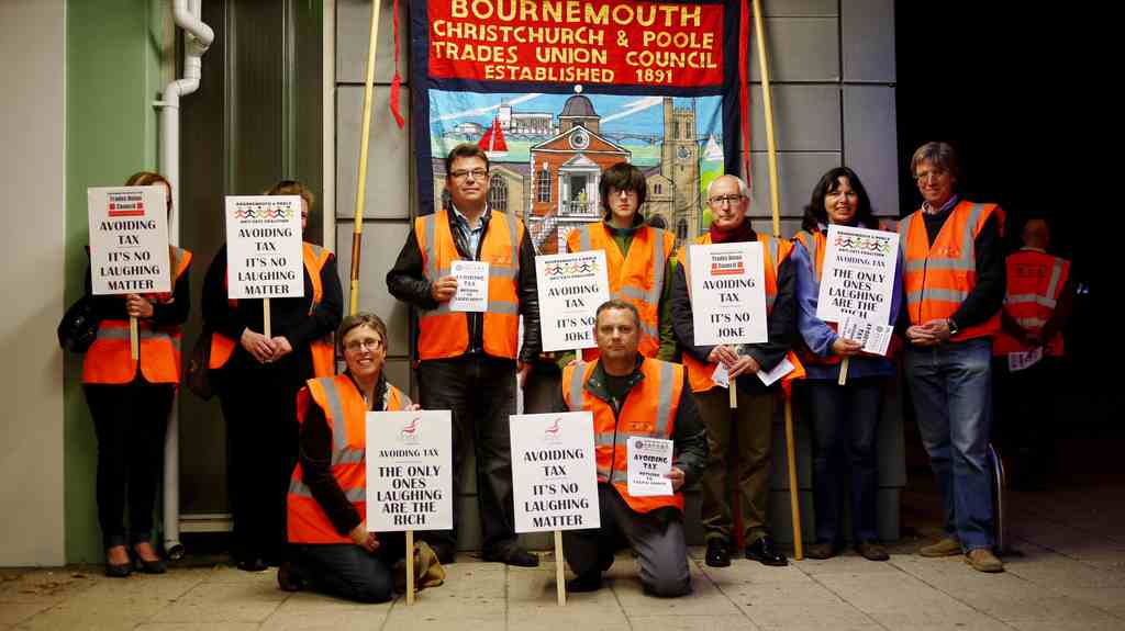 BCPTUC and BPACC members leaflet the audience outside Jimmy Carr’s show at the Lighthouse Theatre, Poole