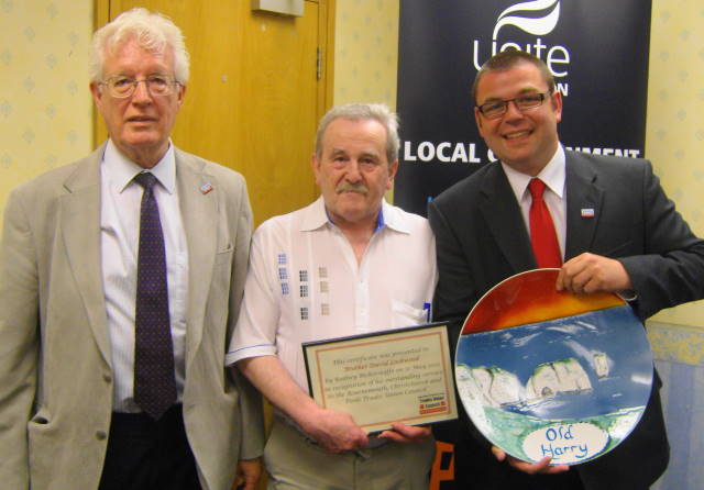Rodney Bickerstaffe (left) and Darren Brown BCPTUC Secretary (right) make a presentation to David Lockwood (centre) for his 20 years’ service to the local trades council